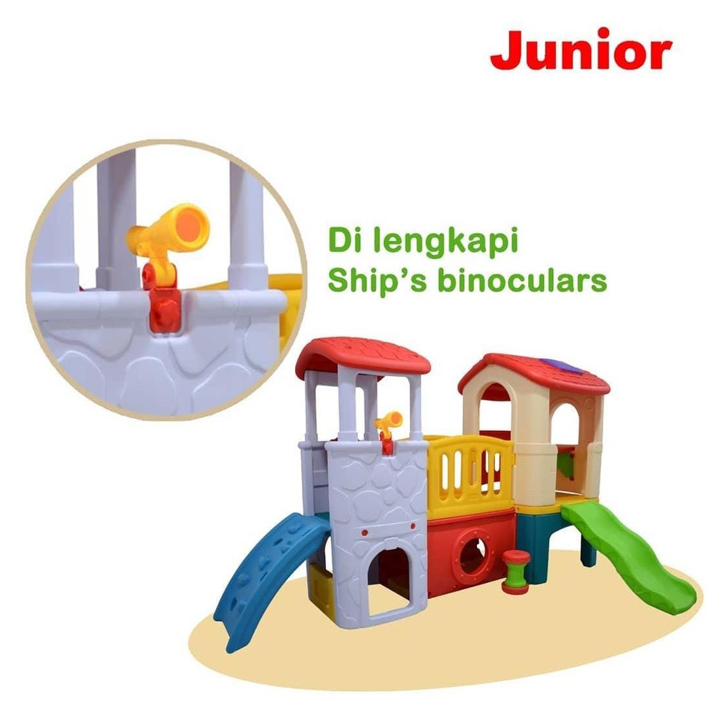 Playground berwarna warni ceria lengkap dengan tangga panjat dan perosotan bergelombang, Arena rumah rumahan yang disambung dengan jembatan dan bagian bawah area bersembunyi dan terowongan. Dilengkapi stir wheel, teropong, dan bangku tentu membuat permainan semakin seru.